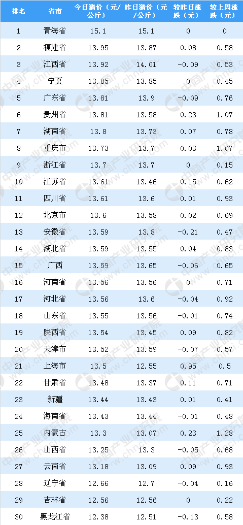 中商情报网讯:据数据统计,2018年8月8日全国外三元生猪价格最高的省份是浙江省,达14.65元/公斤,与昨日价格相比上涨0.14。其次为福建省,福建外三元生猪价格为14.44元/公斤;黑龙江省排名第三,为14.4元/公斤,较昨日价格上涨1.8。