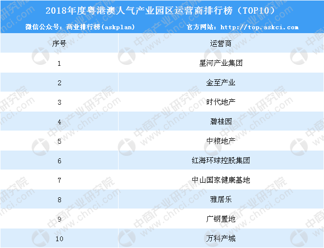 此外,本次会上还发布了2018年度粤港澳人气产业园区运营商排行榜,以下为具体榜单: