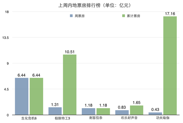《生化危机:终章》在内地实现了超强爆发,首周票房6.44亿,占据大盘半壁江山,无悬念拿下周票房冠军。《极限特工:终极回归》和《刺客信条》拿下周票房亚季军。《欢乐好声音》、《功夫瑜伽》位居周票房四五名。