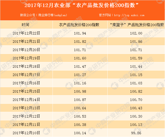 中商情报网讯:据农业部监测,12月22日“农产品批发价格200指数”为101.94,比昨天上升0.12个点,“菜篮子”产品批发价格200指数为102.00,比昨天上升0.14个点。