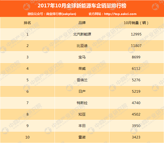 车企方面,10月北汽新能源累计销量排名第一,销量达1.3万辆。随后排名依次为比亚迪、宝马、荣威、雪佛兰、日产、特斯拉、知豆、丰田、雷诺。