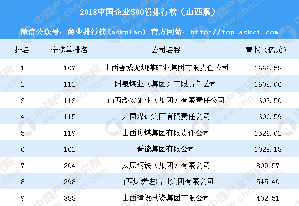 其中山西共有9家企业上榜,营收共计10795.41亿元,6家企业营收超千亿,分别为:山西晋城无烟煤矿业集团有限责任公司、阳泉煤业(集团)有限责任公司、山西潞安矿业(集团)有限责任公司、大同煤矿集团有限责任公司、山西焦煤集团有限责任公司、晋能集团有限公司。山西晋城无烟煤矿业集团有限责任公司营收最多,共计1666.58亿元。山西建设投资集团有限公司垫底,营收不足500亿元,仅402.51亿元。
