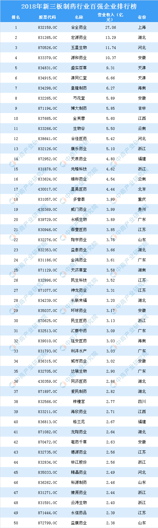 具体来看:2018年新三板制药行业上市公司营业收入100强排行榜中,营业收入超过10亿元的有(4家)。其中,营业收入位居第一的是来自上海的合全药业,达27.06亿元。宏源药业位居第二,营业收入为13.29亿元。玉星生物位居第三,营业收入为11.74亿元。