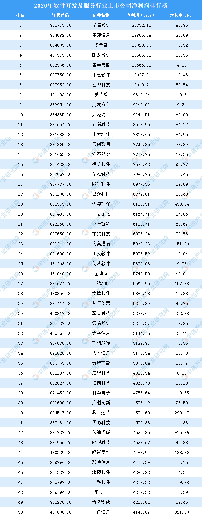 中商情报网讯:据中商产业研究院大数据库数据显示,2019年上市公司整体表现良好;共有1023家软件开发及服务行业上市公司公布净利润,其中,有314家净利润为负。据榜单显示:华信股份、中建信息、挖金客、麟龙股份、国电康能、思迅软件、创识科技、微传播、用友汽车、力港网络为2019年软件开发及服务行业净利润前十企业。据统计,前十企业净利润共计14.75亿元。其中,净利润位居第一的是华信股份,达3.64亿元,同比增长80.95%。中建信息位居第二,净利润为2.98亿元,同比增长38.09%。挖金客位居第三,净利润为1.2亿元,同比增长95.32%。