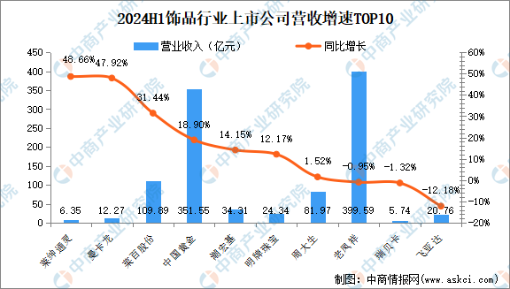 2024年上半年,中国饰品行业营业收入实现正增长的上市公司有7家,负增长的公司有8家。其中,营业收入同比增长最高的10家企业分别为莱绅通灵、曼卡龙、菜百股份、中国黄金、潮宏基、明牌珠宝、周大生、老凤祥、瑞贝卡、飞亚达。