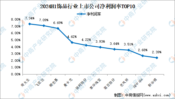 2024年上半年,饰品行业15家上市公司中,有3家公司净利润率在5%以上,净利润率为负的公司2家。其中,净利润率排在前十的公司分别为周大生、飞亚达、潮宏基、曼卡龙、迪阿股份、萃华珠宝、菜百股份、老凤祥、深中华A、新华锦。