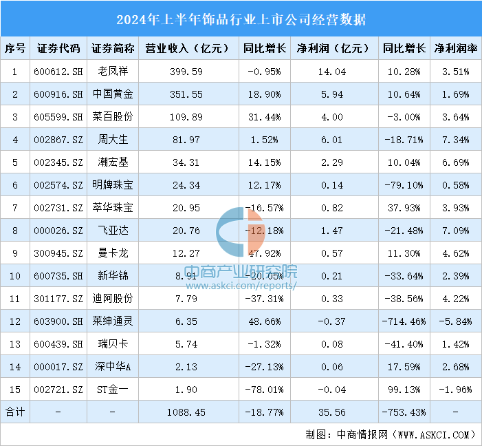 中商情报网讯:2024年上半年,饰品行业15家上市公司合计实现营收1088.45亿元,同比减少18.77%;合计净利润35.56亿元,同比减少753.43%。其中,营收前十的公司分别为老凤祥、中国黄金、菜百股份、周大生、潮宏基、明牌珠宝、萃华珠宝、飞亚达、曼卡龙、新华锦。
