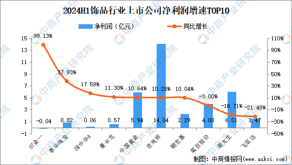 2024年上半年,饰品行业15家上市公司中,净利润为正增长的公司7家,负增长的公司8家。其中,净利润同比增长最高的10家企业分别为ST金一、萃华珠宝、深中华A、曼卡龙、中国黄金、老凤祥、潮宏基、菜百股份、周大生、飞亚达。