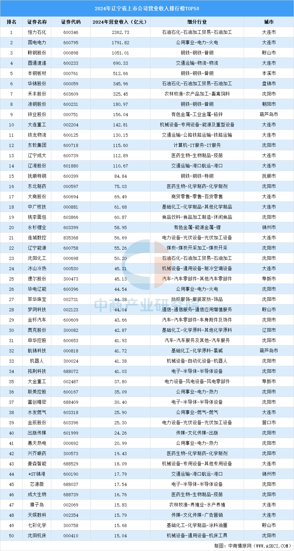 中商情报网讯:目前,A股上市公司相继发布2024年年度报告。本榜单以2024年营业收入为标准,汇总了辽宁省营业收入排名前50的上市公司。