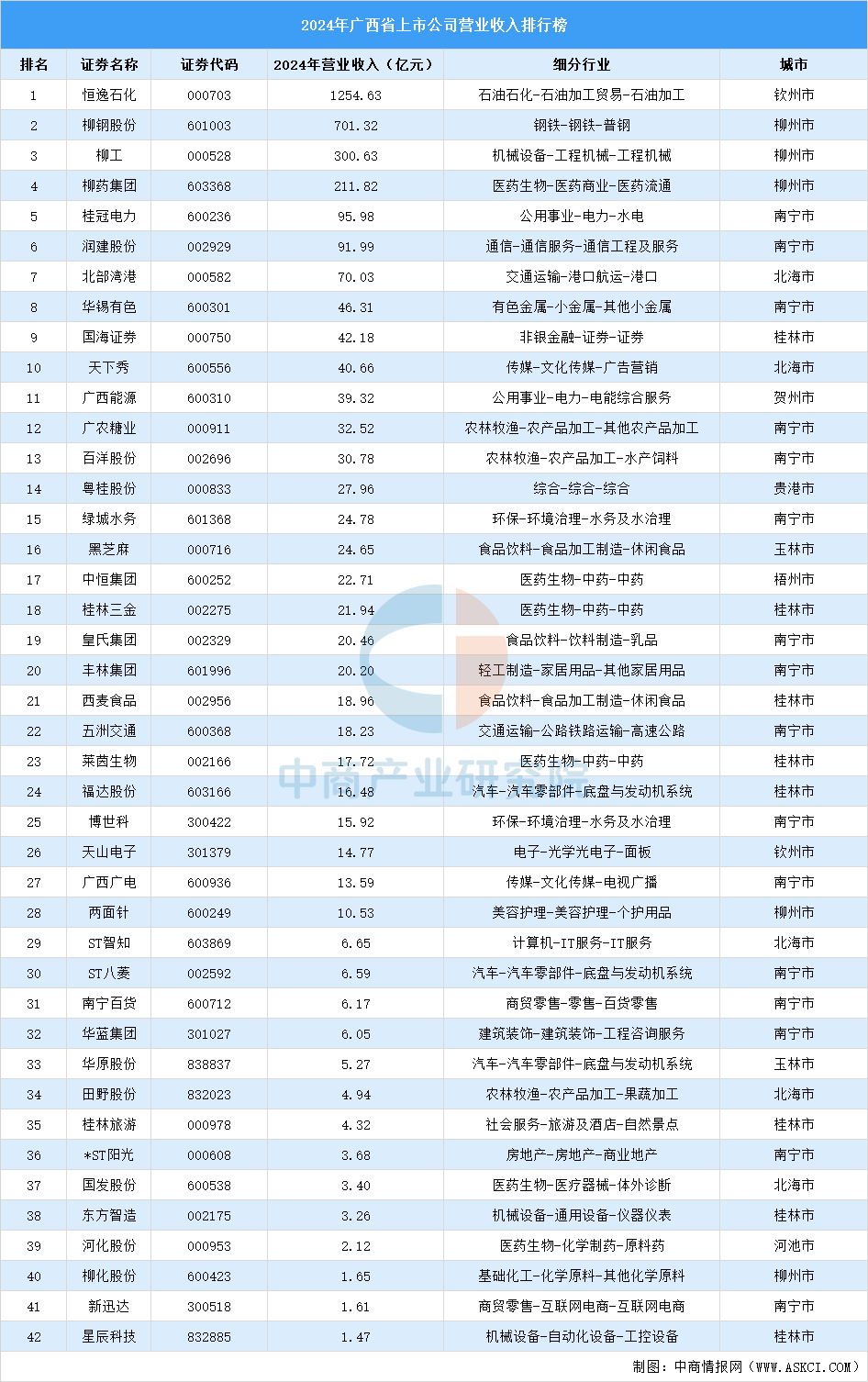 中商情报网讯:目前,A股上市公司相继发布2024年年度报告。本榜单以2024年营业收入为标准,汇总了广西省上市公司营业收入排名。
