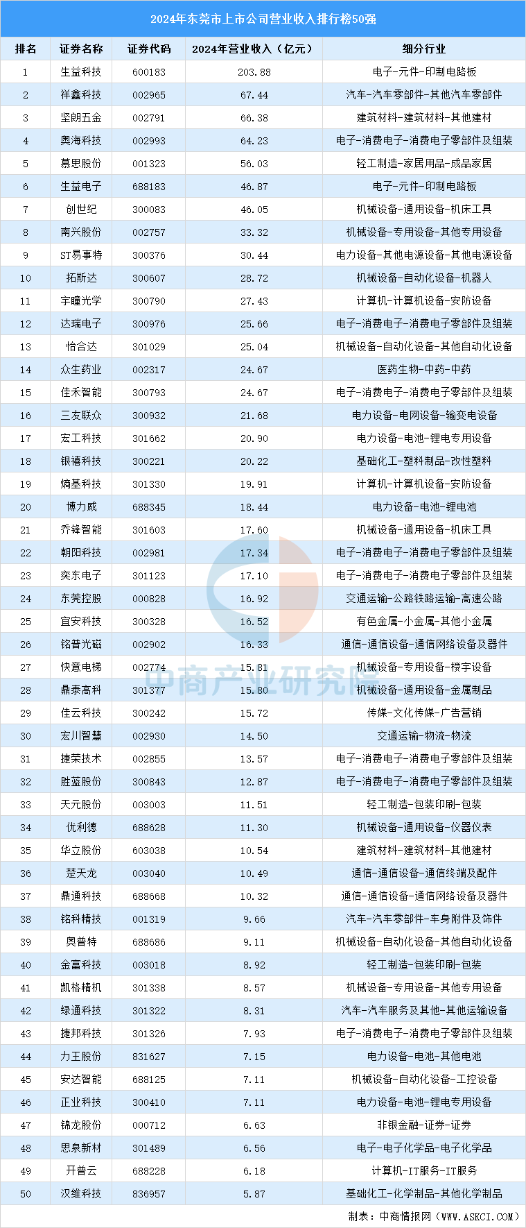 中商情报网讯:目前,A股上市公司相继发布2024年年度报告。本榜单以2024年营业收入为标准,汇总了东莞市营业收入排名前50的上市公司。