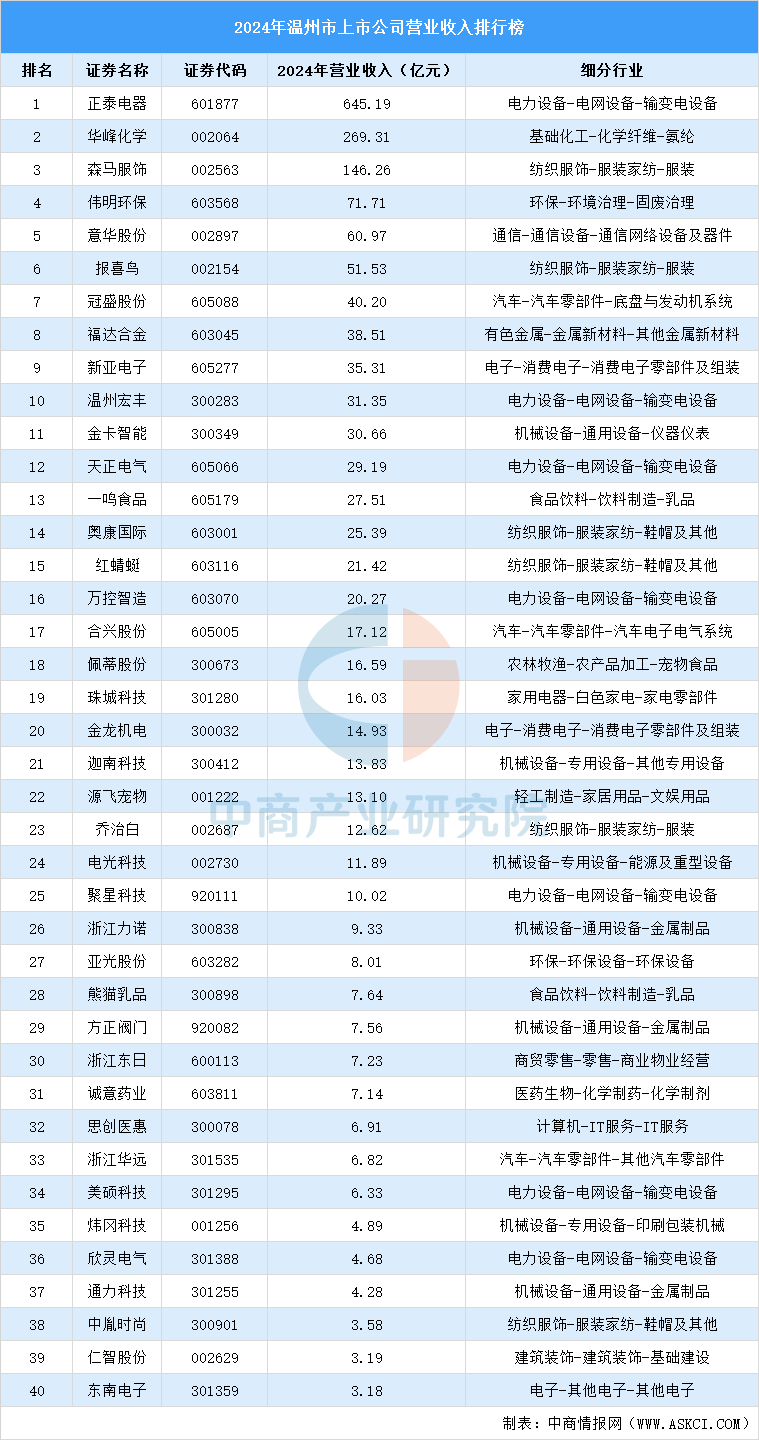 榜单中,正泰电器、华峰化学、森马服饰位列前三,伟明环保、意华股份、报喜鸟、冠盛股份、福达合金、新亚电子和温州宏丰跻身前十。2024年温州市上市公司共累计实现营业收入1761.68亿元。以下是2024年温州市上市公司营业收入排行榜:
