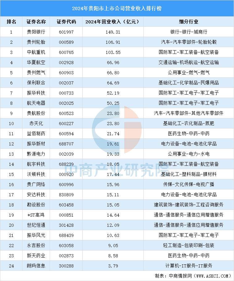 榜单中,贵阳银行、贵州轮胎、中航重机位列前三,华夏航空、贵州燃气、保利联合、振华科技、航天电器、贵航股份和赤天化跻身前十。2024年贵阳市上市公司共累计实现营业收入909.33亿元。以下是2024年贵阳市上市公司营业收入排行榜: