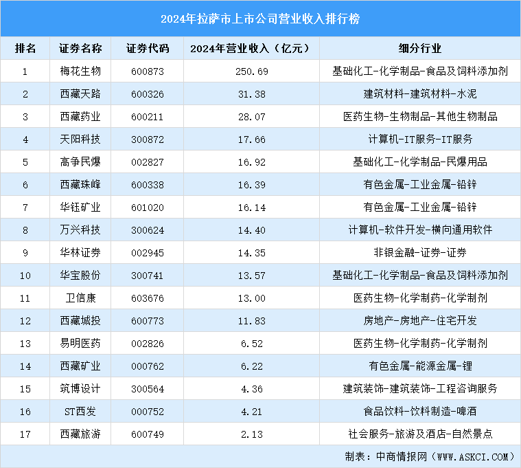 榜单中,梅花生物、西藏天路、西藏药业位列前三,天阳科技、高争民爆、西藏珠峰、华钰矿业、万兴科技、华林证券和华宝股份跻身前十。2024年拉萨市上市公司共累计实现营业收入467.84亿元。以下是2024年拉萨市上市公司营业收入排行榜: