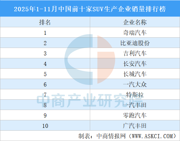 中商情报网讯:2025年1-11月,销量排名前十位的SUV生产企业共销售958.3万辆,占SUV销售总量的65.9%。奇瑞汽车销量最高超200万辆,比亚迪股份、吉利汽车排名第二和第三,长安汽车、长城汽车、一汽大众、特斯拉、一汽丰田、零跑汽车、广汽丰田进入前十,依次排名第4-10名。