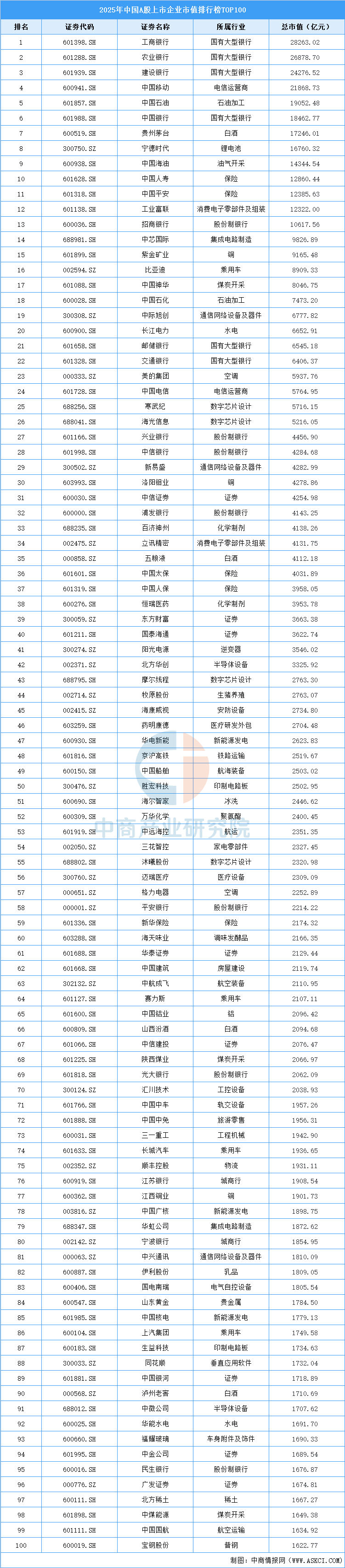 中商情报网讯:中商产业研究院数据库显示,截止到2025年12月31日,2025年中国A股上市企业前100名市值累计510444.95亿元,占全部A股上市企业市值的41.5%。