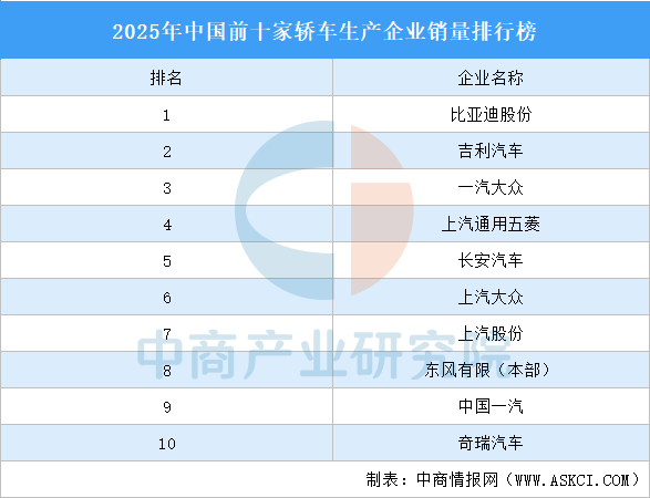 中商情报网讯:2025年,销量排名前十位的轿车生产企业共销售854.7万辆,占轿车销售总量的68.8%。其中,比亚迪股份销量最高,吉利汽车、一汽大众排名第二和第三,上汽通用五菱、长安汽车、上汽大众、上汽股份、东风有限(本部)、中国一汽、奇瑞汽车进入前十,依次排名第4-10名。