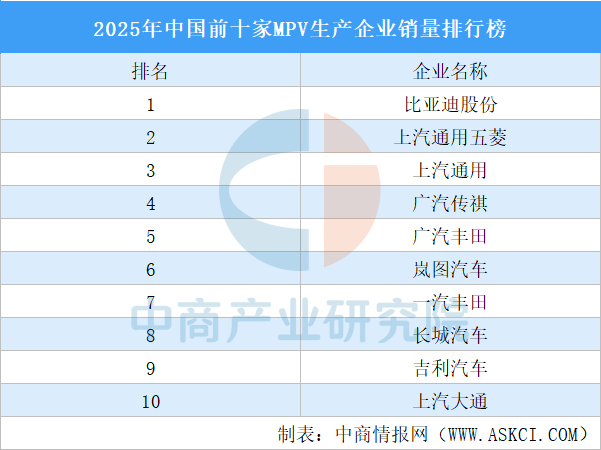 中商情报网讯:2025年,销量排名前十位的MPV生产企业共销售95万辆,占MPV销售总量的78.3%。其中,比亚迪股份销量最高,上汽通用五菱、上汽通用排名第二和第三,广汽传祺、广汽丰田、岚图汽车、一汽丰田、长城汽车、吉利汽车、上汽大通进入前十,依次排名第4-10名。