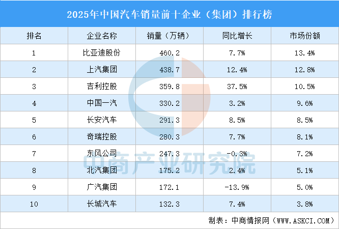 中商情报网讯:2025年,汽车销量排名前十位的企业(集团)共销售2887.6万辆,占汽车销售总量的83.9%。其中,比亚迪股份销量最高达460.2万辆,市场份额13.4%。上汽集团、吉利控股排名第二和第三,销量分别为438.7万辆、359.8万辆,市场份额分别为12.8%、10.5%。中国一汽、长安汽车、奇瑞控股、东风公司、北汽集团、广汽集团、长城汽车进入前十,依次排名第4-10名。
