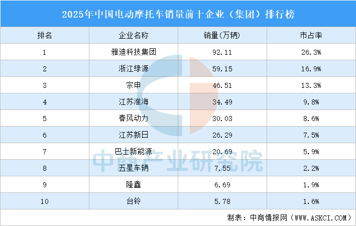 中商情报网讯:2025年全行业完成电动摩托车销量350.62万辆,同比增长1.14%。TOP企业销量合计329.29万辆,市占率合计94.0%。