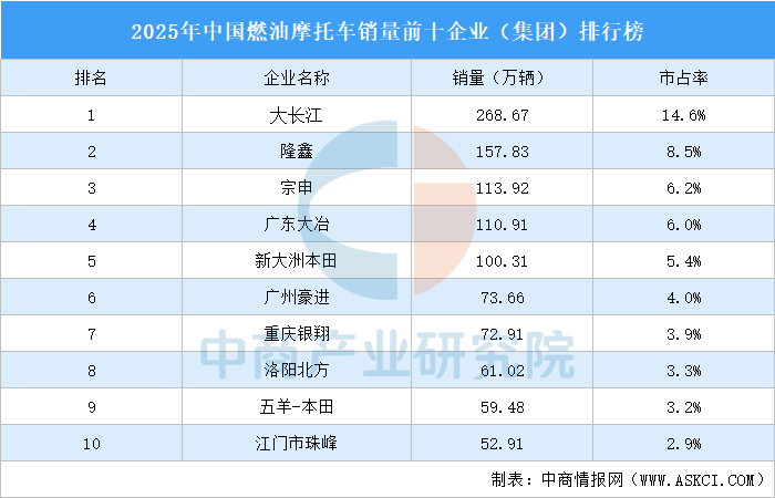 中商情报网讯:2025年全行业完成燃油摩托车销量1846.15万辆,同比增长12.16%。TOP10企业燃油摩托车销量合计1071.62万辆,市占率合计58.0%。