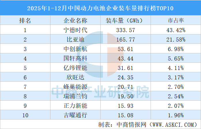 中商情报网讯:2025年1-12月,国内动力电池累计装车量769.7GWh,累计同比增长40.4%。TOP3企业动力电池装车量市占率合计71.98%,TOP5企业动力电池装车量市占率合计81.74%,TOP10企业动力电池装车量市占率合计94.18%。