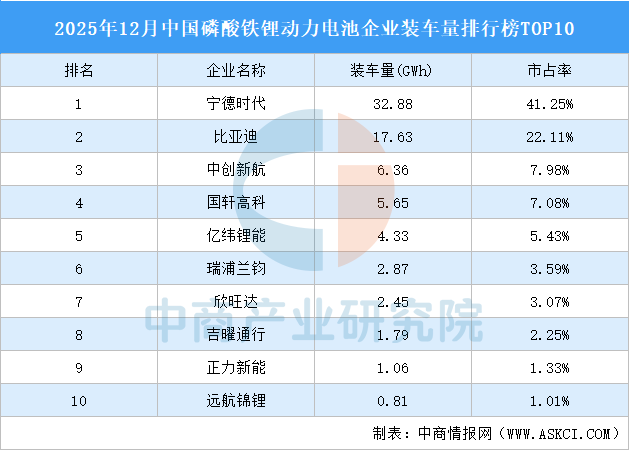 中商情报网讯:12月,国内磷酸铁锂动力电池装车量79.8GWh,环比增长5.9%,同比增长33.7%。TOP10企业磷酸铁锂动力电池装车量合计75.83GWh,市占率95.10%。