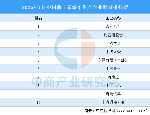 中商情报网讯:2026年1月,销量排名前十位的轿车生产企业共销售52.5万辆,占轿车销售总量的70.4%。吉利汽车销量最高,比亚迪股份、一汽大众排名第二和第三,上汽大众、东风有限(本部)、上汽股份、特斯拉、中国一汽、奇瑞汽车、上汽通用五菱进入前十,依次排名第4-10名。