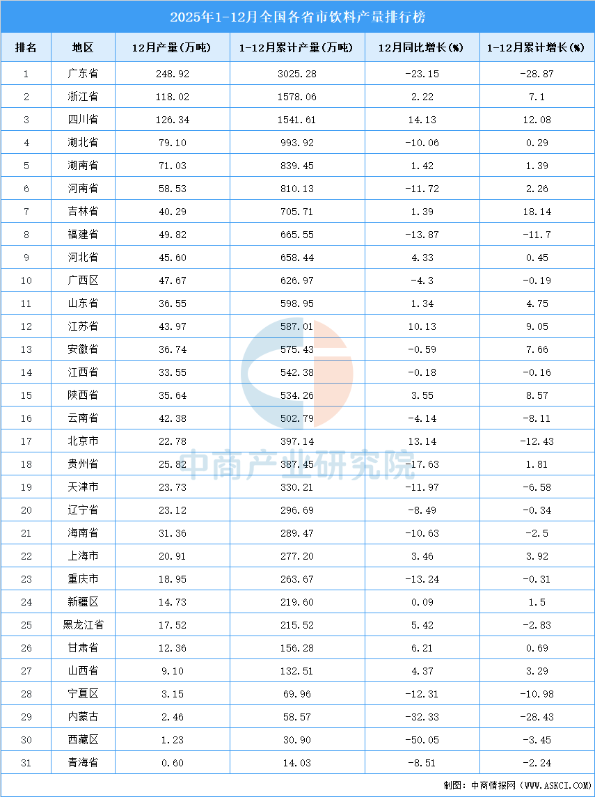 2025年全国饮料产量前十省市分别是广东省、浙江省、四川省、湖北省、湖南省、河南省、吉林省、福建省、河北省、广西。其中,2025年广东省饮料产量排名第一,累计产量为3025.28万吨。