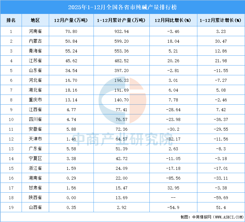 2025年1-12月全国纯碱产量前十省市分别是河南省、内蒙古、青海省、江苏省、山东省、河北省、湖北省、重庆市、江西省、四川省。其中,2025年1-12月河南省纯碱产量排名第一,累计产量为932.94万吨。