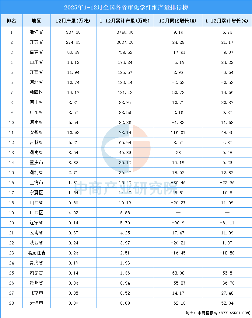 2025年1-12月全国化学纤维产量前十省市分别是浙江省、江苏省、福建省、山东省、江西省、河北省、新疆、四川省、广东省、河南省。其中,2025年1-12月浙江省化学纤维产量排名第一,累计产量为3749.06万吨。