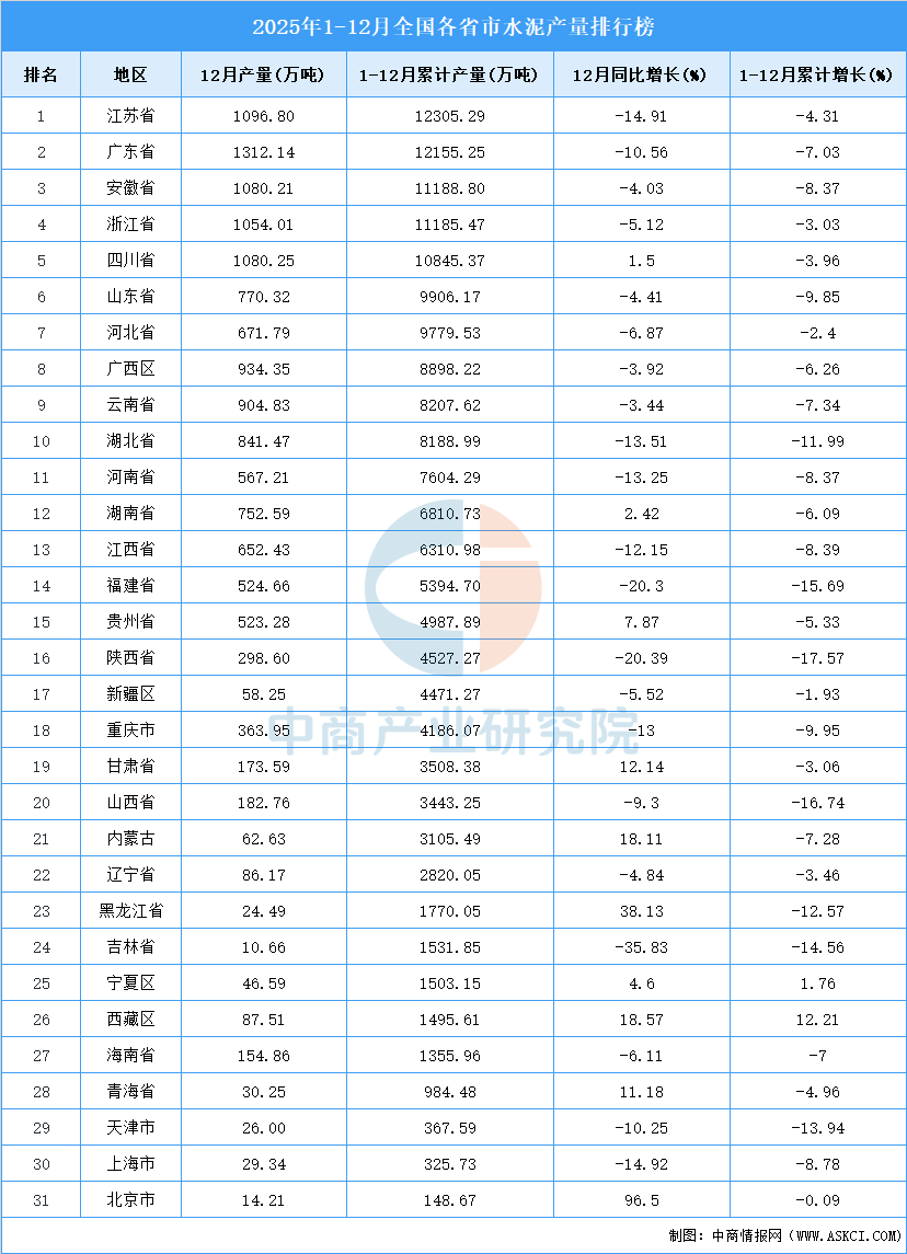 2025年1-12月全国水泥产量前十省市分别是江苏省、广东省、安徽省、浙江省、四川省、山东省、河北省、广西、云南省、湖北省。其中,2025年1-12月江苏省水泥产量排名第一,累计产量为12305.29万吨。
