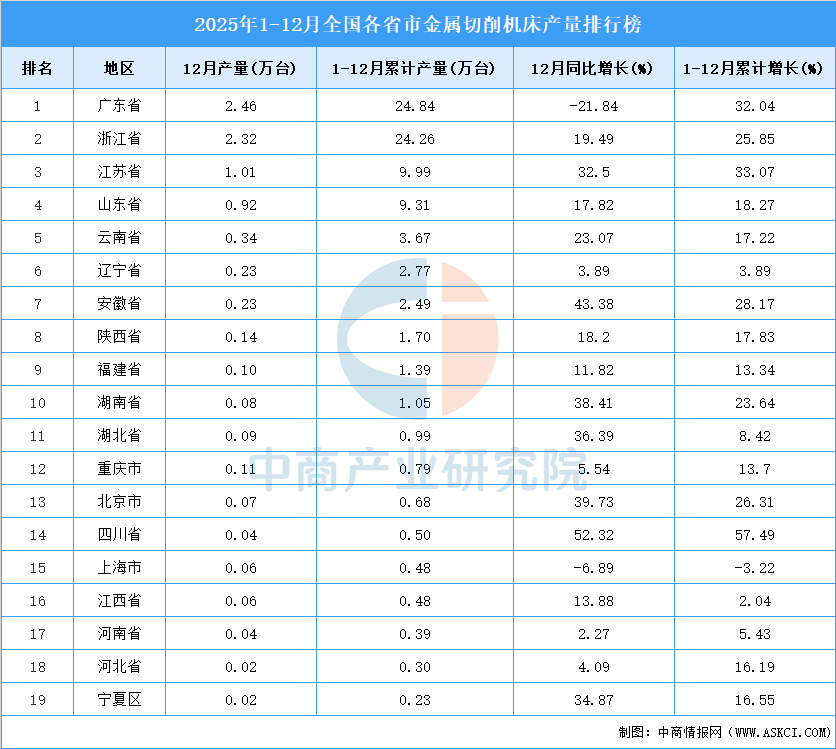 2025年1-12月全国金属切削机床产量前十省市分别是广东省、浙江省、江苏省、山东省、云南省、辽宁省、安徽省、陕西省、福建省、湖南省。其中,2025年1-12月广东省金属切削机床产量排名第一,累计产量为24.84万台。