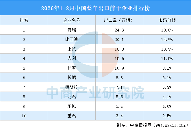 中商情报网讯:1-2月,汽车出口135.2万辆,同比增长48.4%。其中,奇瑞出口量达24.3万辆,市场份额18%。比亚迪、上汽排名第二和第三,出口量分别为20.1万辆、18.8万辆,市场份额分别为14.9%、13.9%。吉利、长安、长城、特斯拉、北汽、东风、重汽进入前十,依次排名第4-10名。