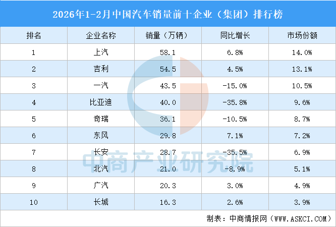中商情报网讯:1-2月,汽车销量排名前十位的集团销量合计为348.3万辆,市场份额合计83.9%。其中,上汽销量最高达58.1万辆,市场份额14.0%。吉利、一汽排名第二和第三,销量分别为54.5万辆、43.5万辆,市场份额分别为13.1%、10.5%。比亚迪、奇瑞、东风、长安、北汽、广汽、长城进入前十,依次排名第4-10名。