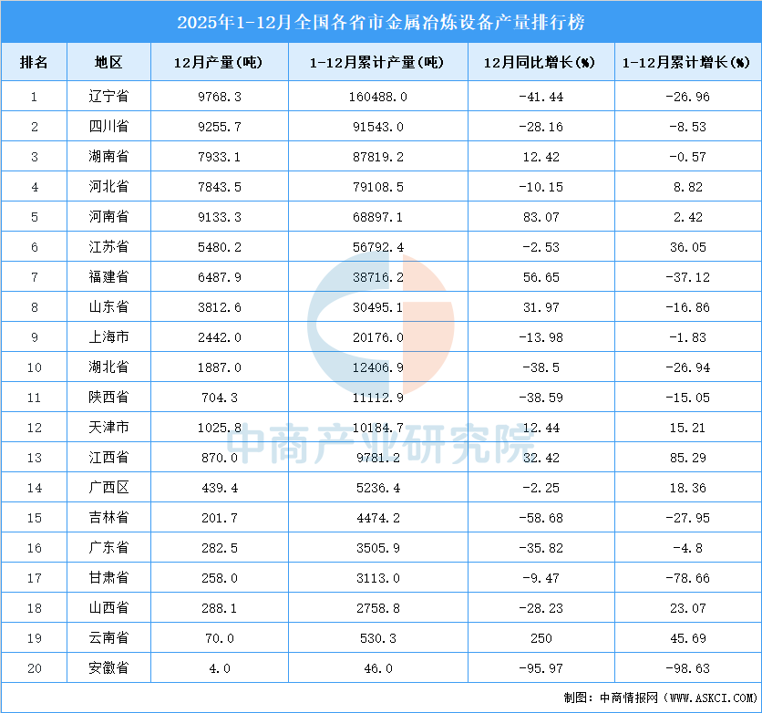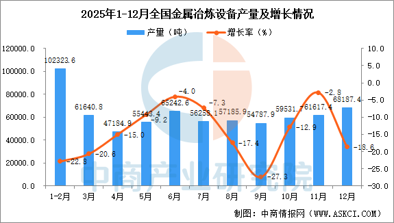 中商情报网讯:据中商产业研究院数据库,2025年12月全国金属冶炼设备当月产量与去年同期相比下降。2025年12月全国金属冶炼设备产量为6.82万吨,同比下降18.6%。2025年1-12月全国金属冶炼设备产量为69.72万吨,同比下降15.1%。