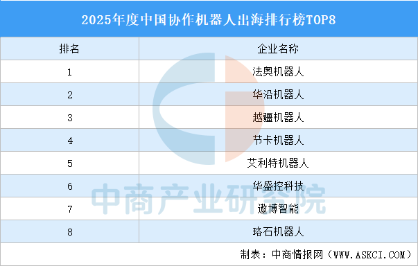 近日,GGII发布2025年度中国协作机器人出海排行TOP8。榜单显示,法奥机器人位居榜首,协作机器人出海规模最大,华沿机器人、越疆机器人排名第二和第三,节卡机器人、艾利特机器人、华盛控科技、遨博智能、珞石机器人依次排名第4-8名。