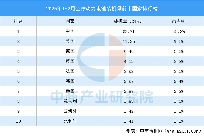 中商情报网讯:2026年1-2月,全球动力电池装机量达124.4GWh,同比增长5%。TOP10国家动力电池装机量合计105.59GWh,市占率合计84.9%。其中,中国动力电池装机量最高达68.71GWh,市占率55.2%。美国、德国动力电池装机量分别为11.85GWh、6.46GWh,市占率分别为9.5%、5.2%。英国、法国、韩国、泰国、意大利、西班牙、比利时进入前十,依次排名第4-10名。