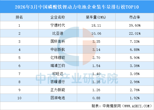 宁德时代磷酸铁锂动力电池装车量最高达18.11GWh,市占率39.60%。比亚迪、国轩高科排名第二和第三,磷酸铁锂动力电池装车量分别为10.06GWh、3.35GWh,市占率分别为22.01%、7.33%。中创新航、亿纬锂能、瑞浦兰钧、欣旺达、吉曜通行、正力新能、因湃电池进入前十,依次排名第4-10名。