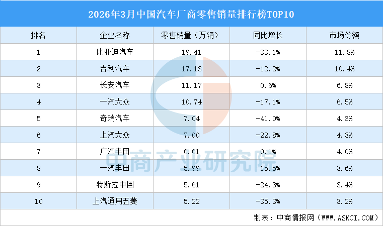 中商情报网讯:2026年3月,中国前十汽车厂商汽车零售销量合计95.94万辆,市场份额合计58.3%。其中,比亚迪汽车零售销量最高达19.41万辆,市场份额11.8%。吉利汽车、长安汽车排名第二和第三,零售销量分别为17.13万辆、11.17万辆,市场份额分别为10.4%、6.8%。一汽大众、奇瑞汽车、上汽大众、广汽丰田、一汽丰田、特斯拉中国、上汽通用五菱进入前十,依次排名第4-10名。