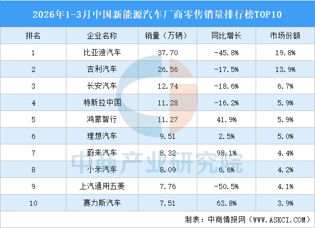 2026年3月中国新能源汽车厂商零售销量排行榜TOP10(附榜单)