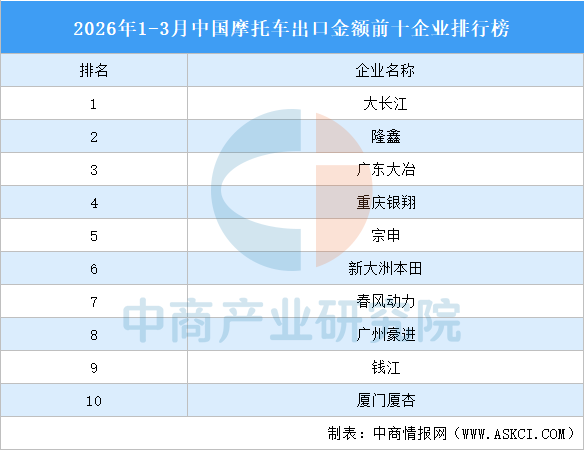 大长江摩托车出口金额最高,超3亿美元,隆鑫、广东大冶排名第二和第三,重庆银翔、宗申、新大洲本田、春风动力、广州豪进、钱江、厦门厦杏进入前十,依次排名第4-10名。