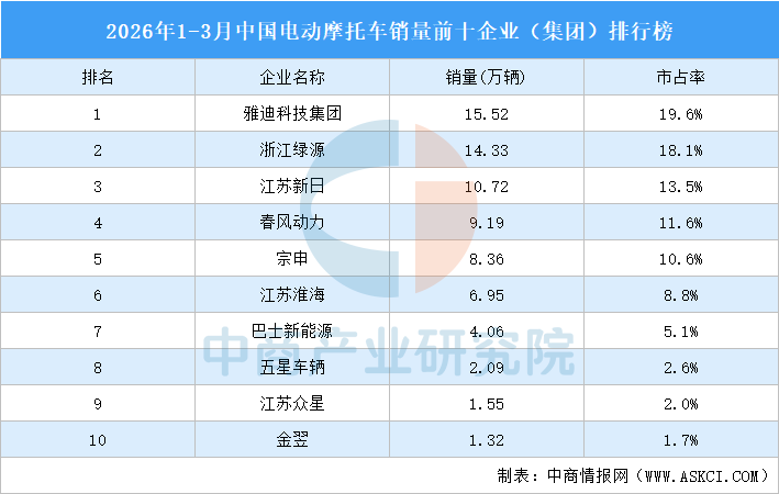 中商情报网讯:1-3月,全行业完成电动摩托车销量79.14万辆,同比下降5.68%。TOP10企业共销售电动摩托车74.11万辆,市占率合计93.6%。