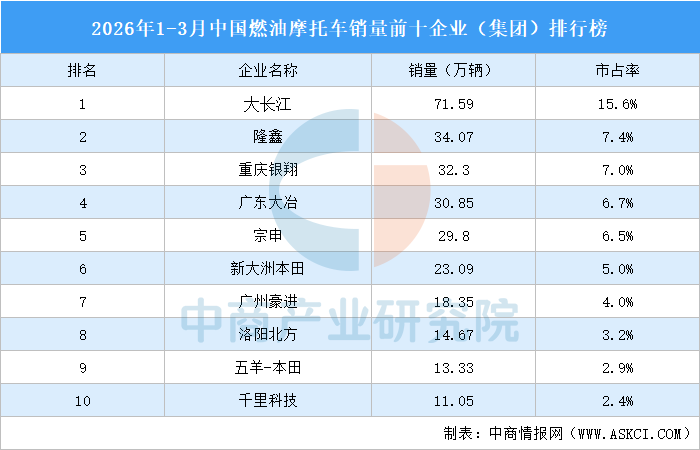 中商情报网讯:1-3月,全行业完成燃油摩托车销量460.35万辆,同比增长12.37%。TOP10家企业共销售摩托车279.1万辆,市占率合计60.63%。