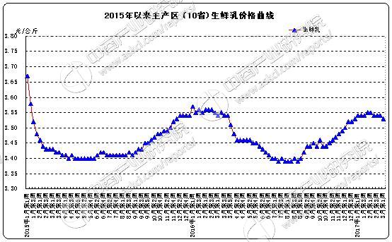 生鲜乳价格。内蒙古、河北等10个奶牛主产省(区)生鲜乳平均价格3.53元/公斤,比前一周下降0.3%,同比下降0.3%。