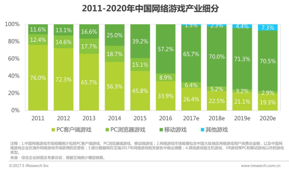 PC端到移动端的转移,移动游戏成为网络游戏市场中最大的细分市场
