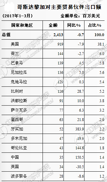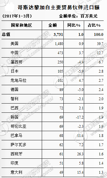 中商情报网讯 据哥斯达黎加统计局统计,2017年1-3月,哥斯达黎加货物进出口总额为61.4亿美元,比上年同期(下同)增长0.3%。其中,出口24.1亿美元,下降0.7%;进口37.3亿美元,增长1.0%。贸易逆差13.2亿美元,增长4.4%。