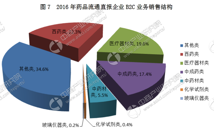 据不完全统计,2016年医药电商直报企业4销售总额达612亿元。其中,B2B(企业对企业)业务销售额576亿元,占医药电商销售总额的94.2%;B2C(企业对顾客)业务销售额36亿元,占医药电商销售总额的5.8%。B2B业务中移动端占4.3%,B2C业务中移动端占46.0%。订单总数4305万,其中B2B订单数1632万,订单转化率96.7%;B2C订单数2673万,订单转化率86.3%。B2B网站活跃用户量27万,平均客单价3652元,平均客品数791个;B2C网站活跃用户量11162万,平均客单价148元,平均客品数11个。B2B日出库完成率98.4%,B2C日出库完成率96.5%。B2B电商业务费用率16.5%,B2C电商业务费用率22.2%,均远超行业平均费用率。B2B与B2C销售结构差异较为明显,B2B业务主要集中在西药类,而B2C业务中其他类5占比最高。