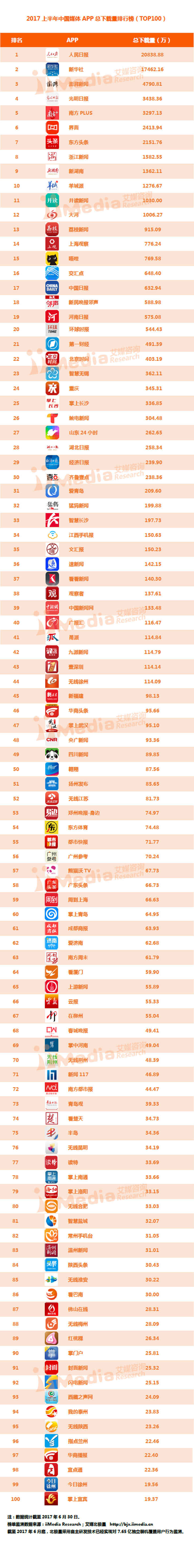 在2017年上半年中国媒体APP总下载量排行榜中,人民日报排名第一,总下载量达20838.88万。以下为2017年上半年中国媒体APP总下载量排行榜(TOP100):