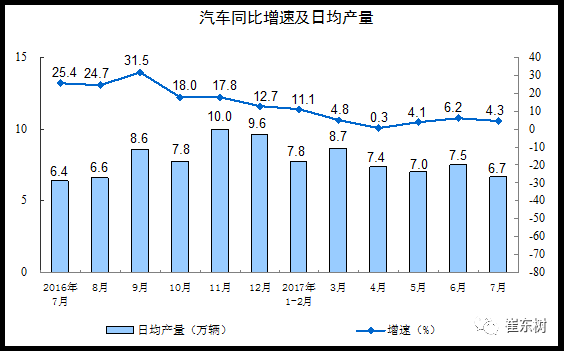 分产品看,7月份汽车生产207万辆,增长4%;31天的日均汽车生产6.7万台。考虑到16年7月的25%较高增速,今年表现相对较稳。